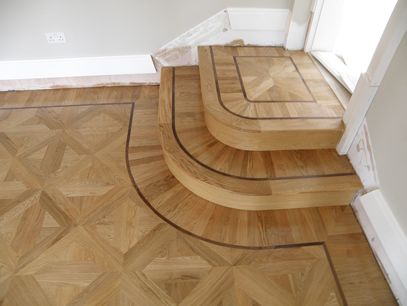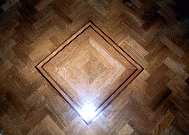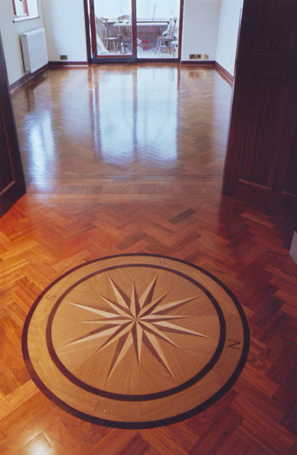 This simple design was built up on site, to make a feature in the herringbone parquet floor. More complicated designs, such as a circular compass can be fabricated off-site on a computer controlled laser cutter. In this way designs of any complexity can be created.