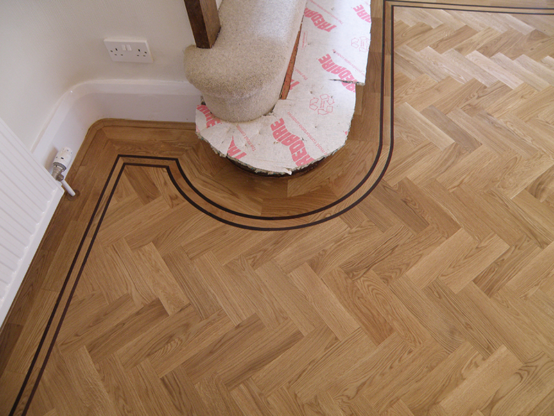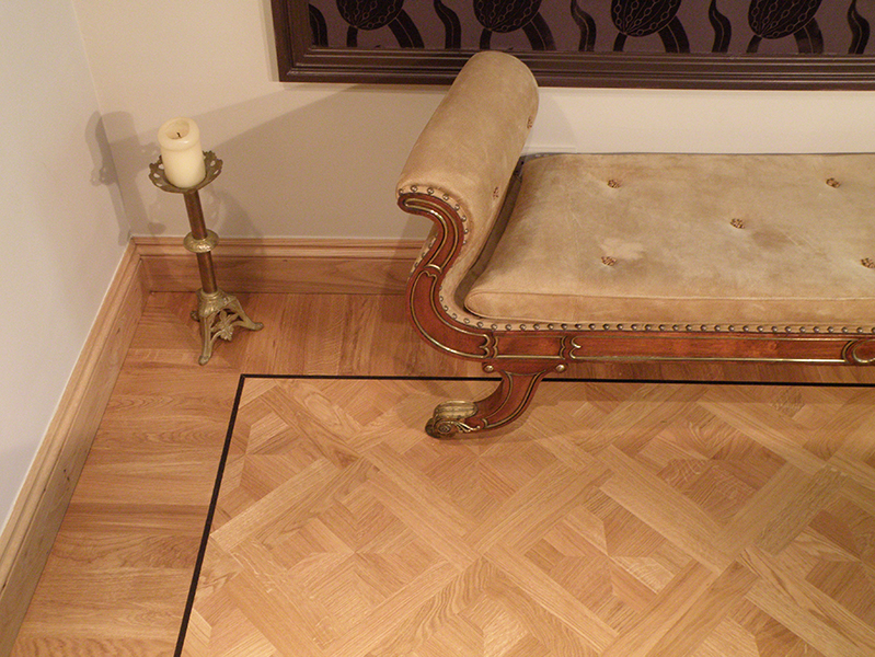This is a parquetry floor that we supplied and installed (Castell pattern), but the border was a soldier course with an additional black feature line, which is different to the more usual double row of blocks or single board border.