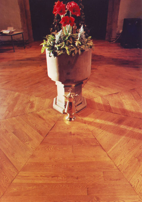 We laid this character oak floor in a church, and produced this octagonal layout around the font as an additional feature. We gave the floor an aged look with the finish.