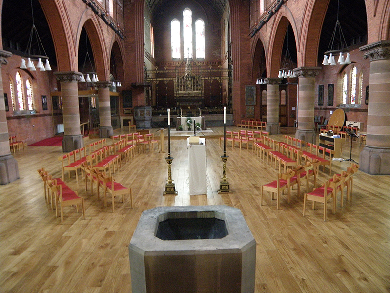 This is a new floor that we installed in St. Dunstan’s church in Liverpool, which is a magnificent listed building. The boards were installed as a floating floor over underfloor heating.