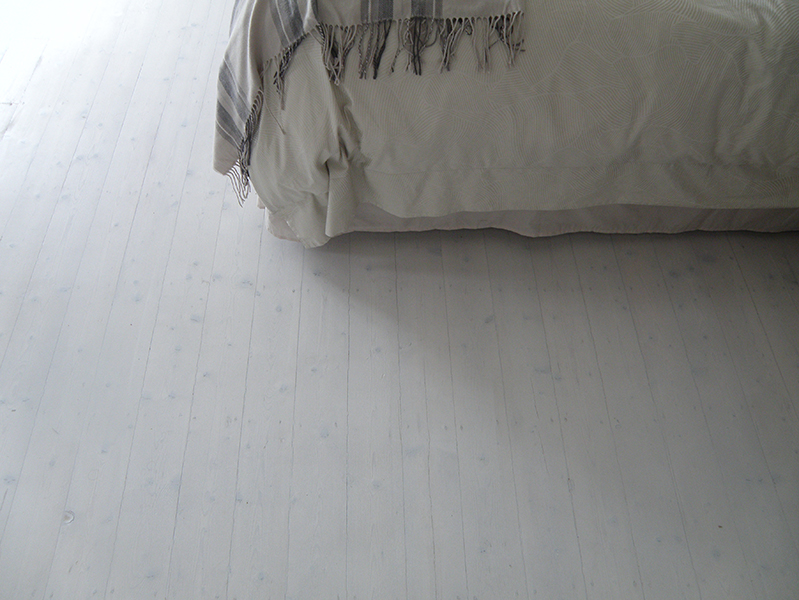 This was a bedroom with pine floorboards, which we bleached with lye and then finished with a white pigmented hardwax oil, which killed off the orangey colour that pine takes on over time.