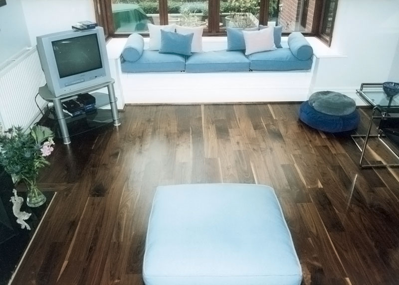 This picture shows the rich, deep tones of walnut boards, with the pale streaks of sapwood (a feature of the character grade) providing highlights. The floor was sealed with hardwax oil.